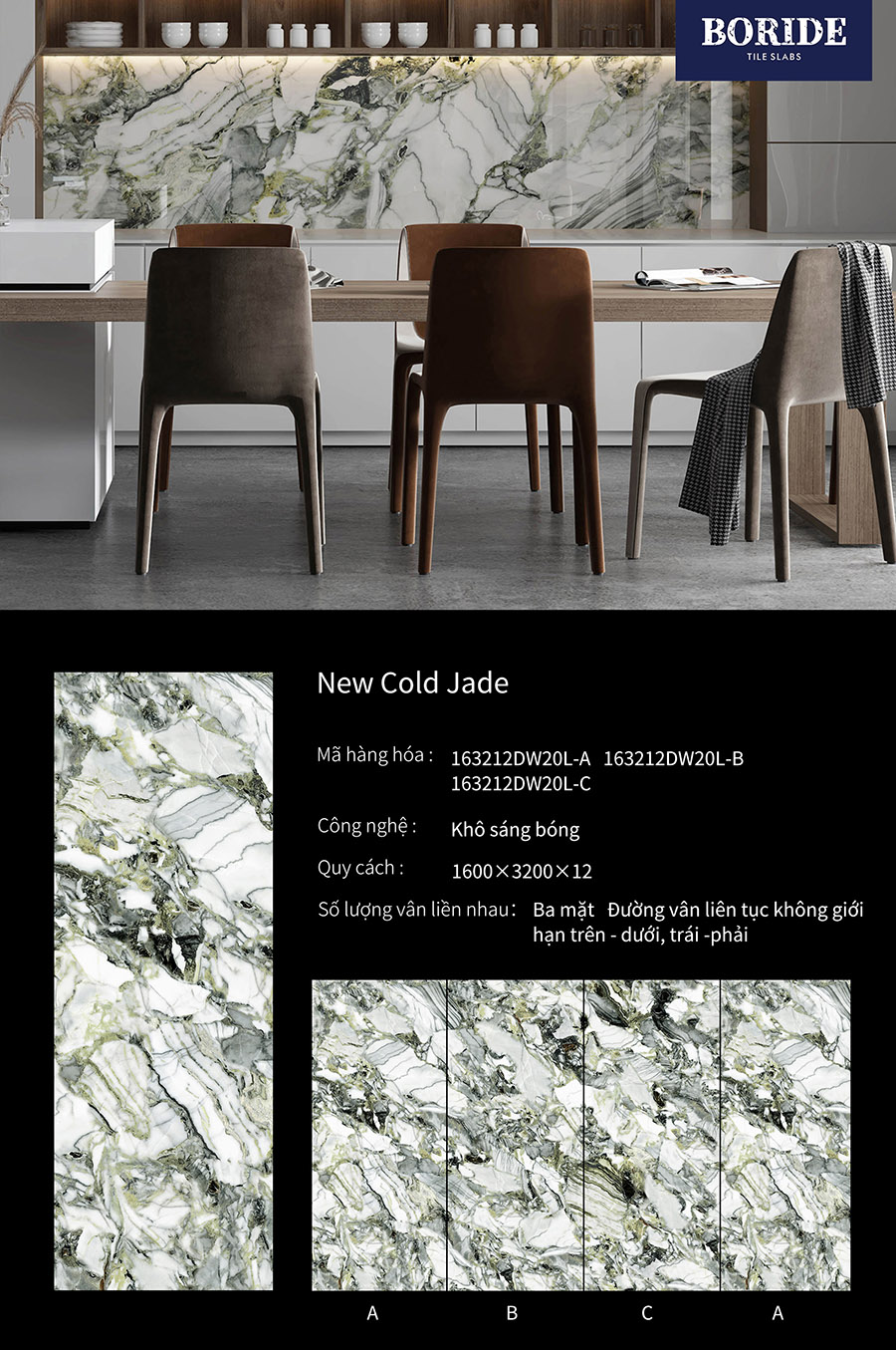 Boride 163212DW20L kích thước 1600x3200mm Công nghệ Bóng. Thương hiệu đá phiến của Ý, sản phẩm có 3 face đường vân ngẫu nhiên, độ dầy 12mm..