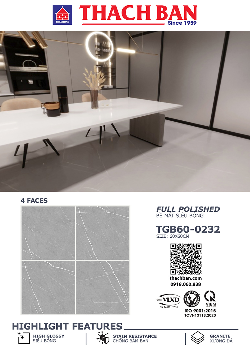 Gạch Tbgres Thạch Bàn TGB-0232 Bề Mặt Bóng kính vân đá vân tia sét, sản xuất Gạch Thạch Bàn, Kích thước: 60X60, 30x60cm Gạch Granite siêu bóng.