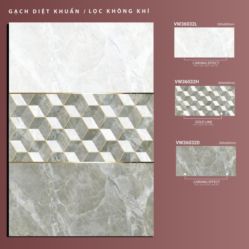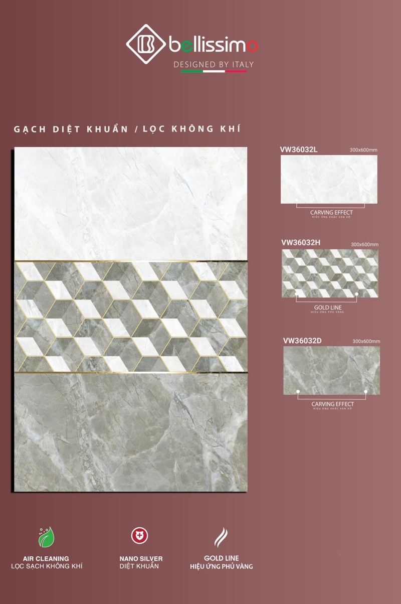 Gạch Bellissimo VW36032L-VW36032H-VW36032D là sản phẩm gạch nhập khẩu designed by italy, diệt khuẩn, lọc không khí, hiệu ứng phủ vàng 1 thùng 8v = 1,44m².