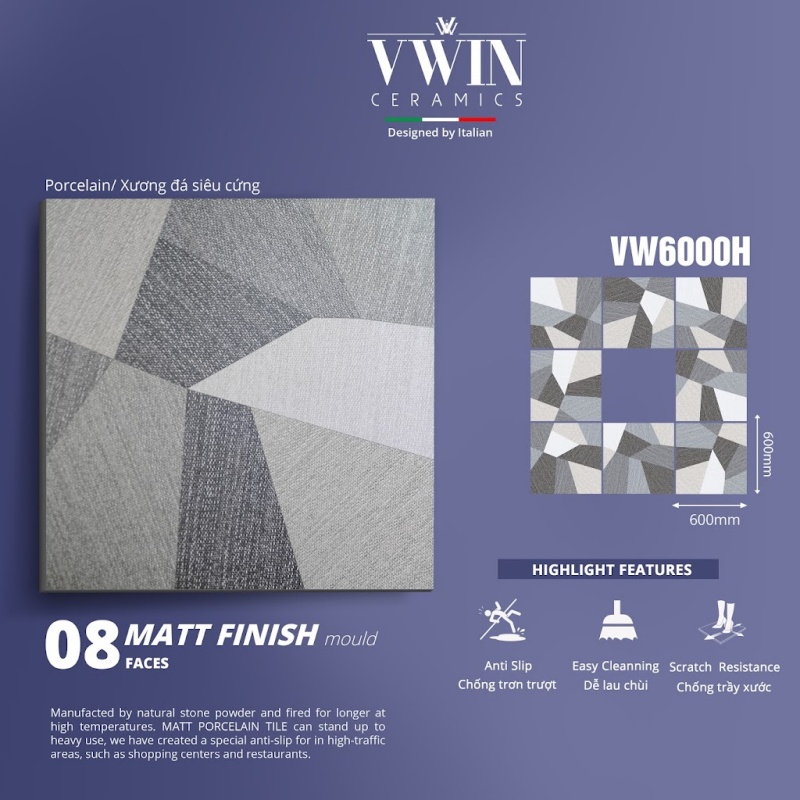 Gạch VWIN VW6000H kích thước 600x600mm là sản phẩm gạch nhập khẩu designed by italy dễ lau chùi, chống trầy xước, 8 faces matt, chỗng trượt…