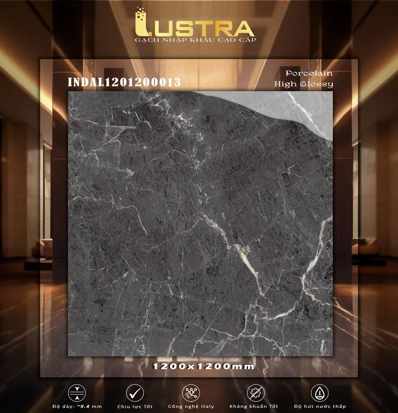 Gạch Lustra INDAL1201200013 (120x120CM) mặt Bóng kính vân đá, dùng Lát nền, ốp tường. Xương gạch Granite có độ hút nước rất thấp (nhỏ hơn 0.5%), dầy 9,4mm