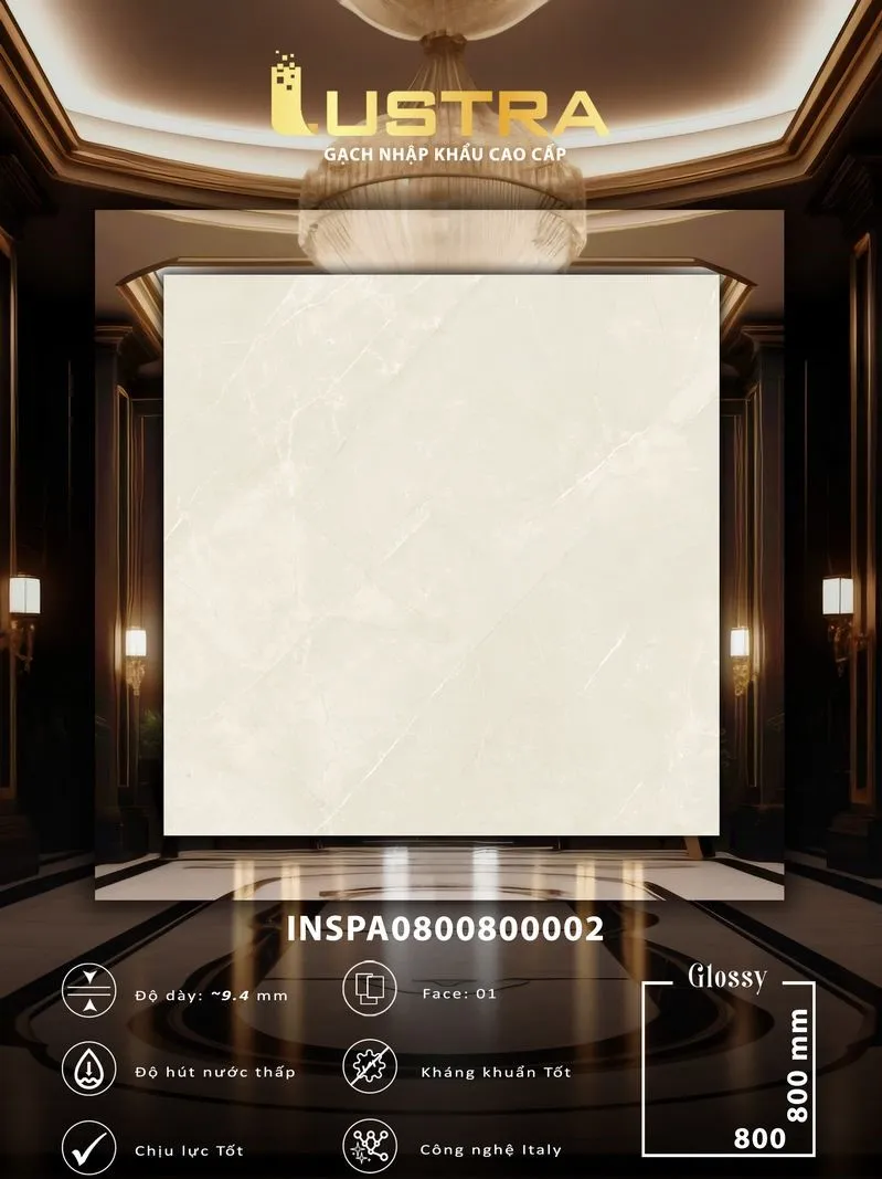 Gạch lustra INSPA0800800002 hàng nhập khẩu từ INDIA size 800x800mm bề mặt Glossy, chống trầy xước, dầy 9,4mm, kháng khuẩn. 1 thùng = 3v= 1.92m²/thùng…