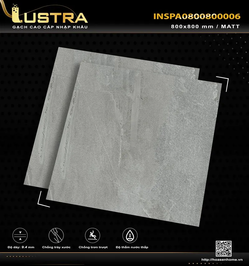 Gạch lustra INSPA0800800006 hàng nhập khẩu từ INDIA size 800x800mm bề mặt MATT, chống trầy xước, dầy 9,4mm, chống trơn trượt. 1 thùng = 3v= 1.92m²/thùng…