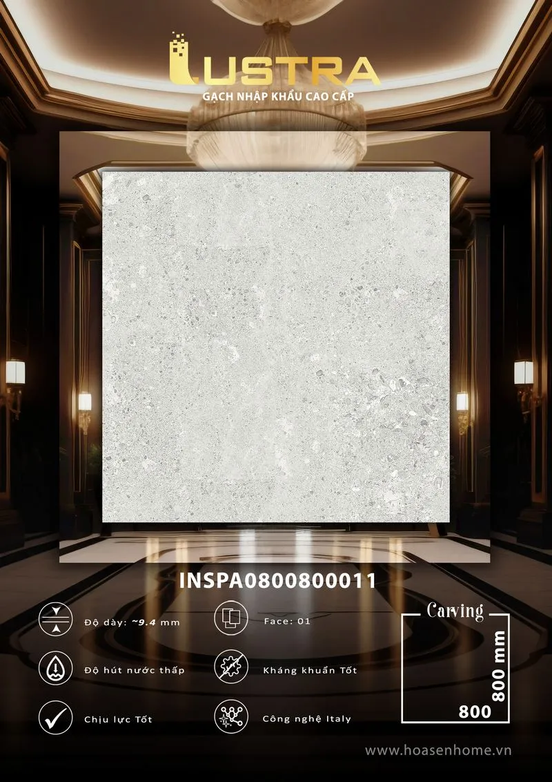 Gạch lustra INSPA0800800011 hàng nhập khẩu từ INDIA size 800x800mm bề mặt MATT, chống trầy xước, dầy 9,4mm, chống trơn trượt. 1 thùng = 3v= 1.92m²/thùng…