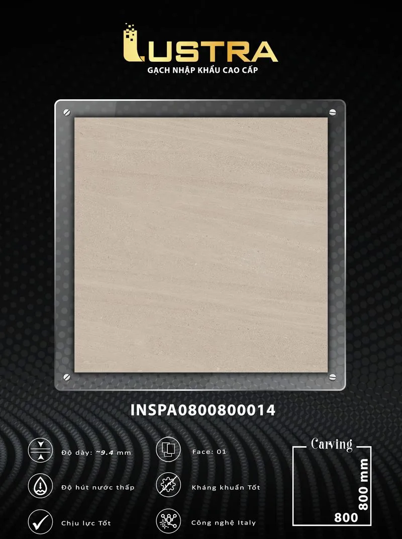 Gạch lustra INSPA0800800014 hàng nhập khẩu từ INDIA size 800x800mm bề mặt MATT, chống trầy xước, dầy 9,4mm, chống trơn trượt. 1 thùng = 3v= 1.92m²/thùng…
