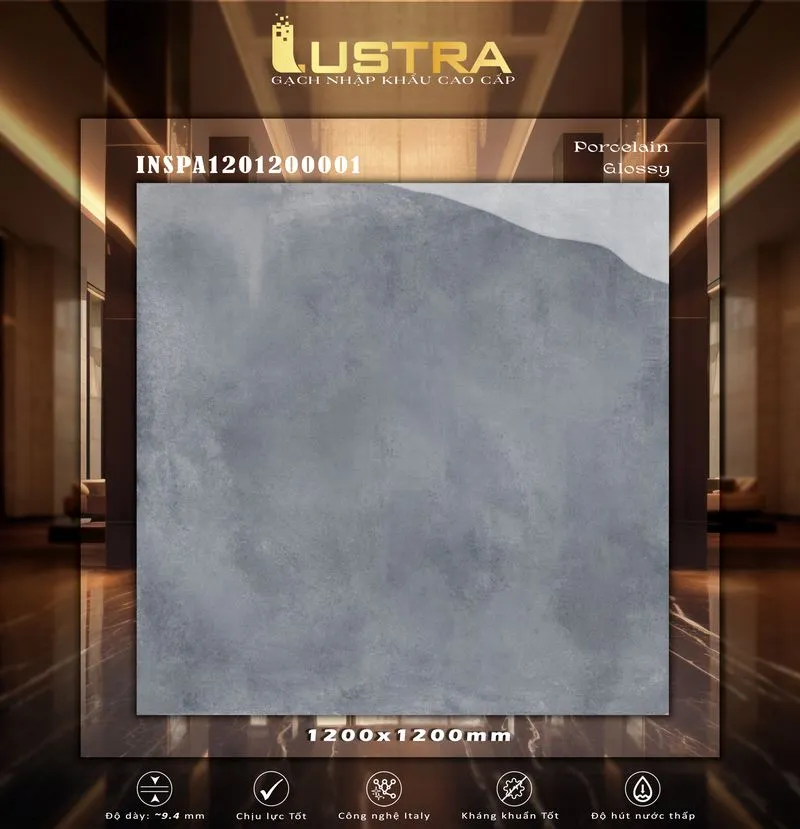 Gạch Lustra INSPA1201200001 (120x120CM) mặt Bóng kính vân đá, dùng Lát nền, ốp tường. Xương gạch Granite có độ hút nước rất thấp (nhỏ hơn 0.5%), dầy 9,4mm
