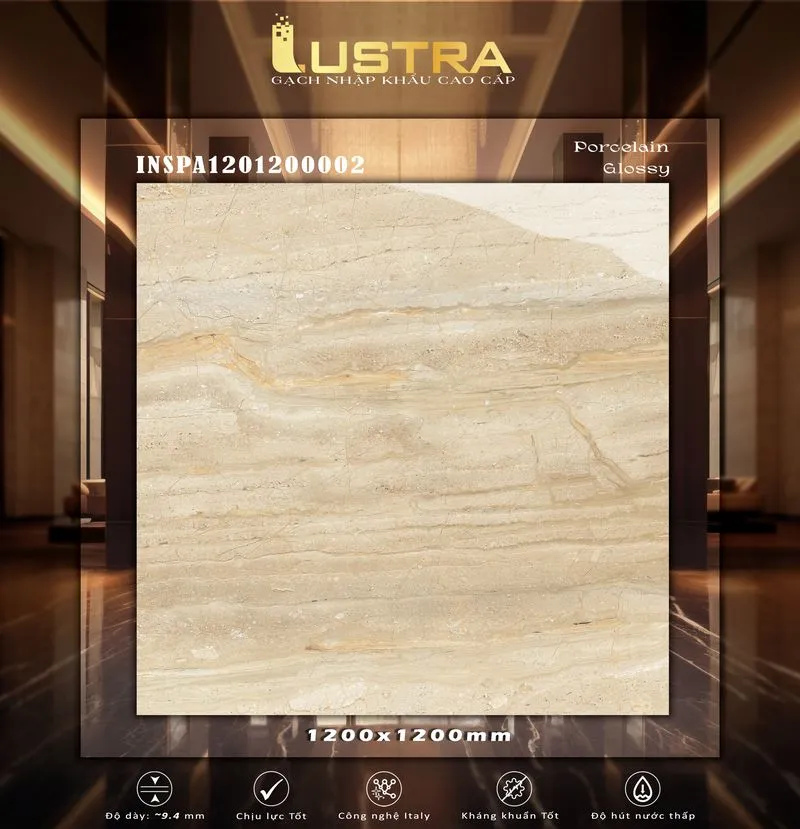 Gạch Lustra INSPA1201200002 (120x120CM) mặt Bóng kính vân đá, dùng Lát nền, ốp tường. Xương gạch Granite có độ hút nước rất thấp (nhỏ hơn 0.5%), dầy 9,4mm