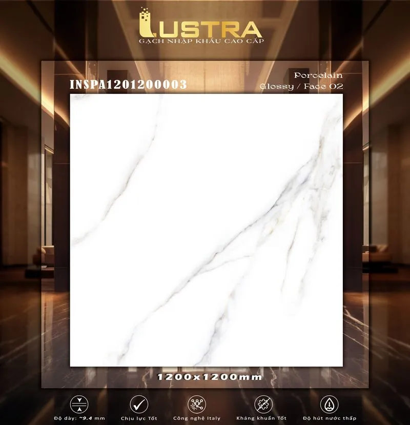 Gạch Lustra INSPA1201200003 (120x120CM) mặt Bóng kính vân đá, dùng Lát nền, ốp tường. Xương gạch Granite có độ hút nước rất thấp (nhỏ hơn 0.5%), dầy 9,4mm