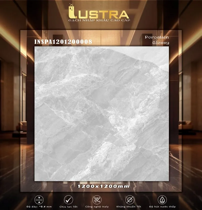 Gạch Lustra INSPA1201200008 (120x120CM) mặt Bóng kính vân đá, dùng Lát nền, ốp tường. Xương gạch Granite có độ hút nước rất thấp (nhỏ hơn 0.5%), dầy 9,4mm