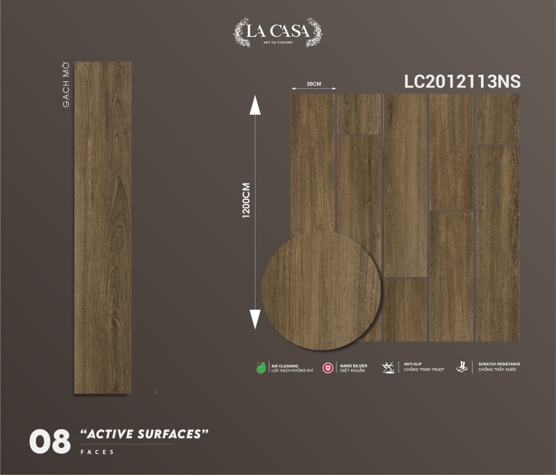 Gạch Lacasa LC2012113NS granite vân gỗ Kích thước thực 200x1200mm sản xuất trên dây truyền hiện đại của Ý. Bề mặt MATT. 1 thùng đóng 6 viên =1,44m²/36Kg.